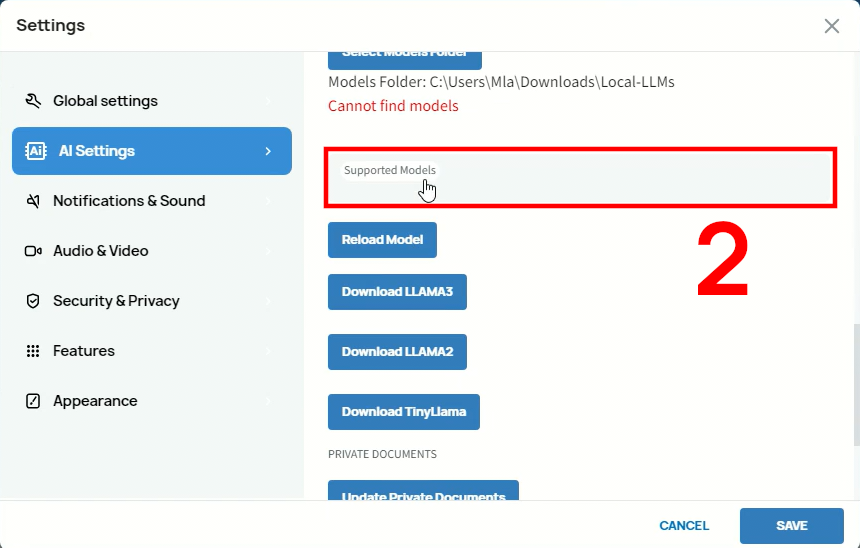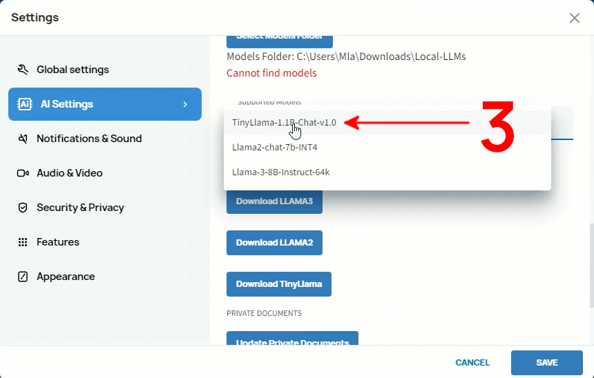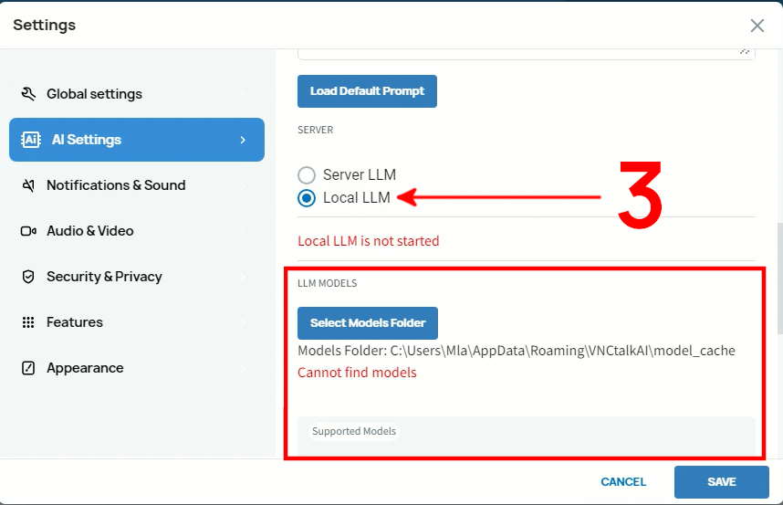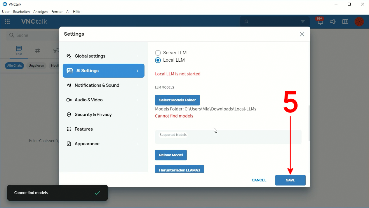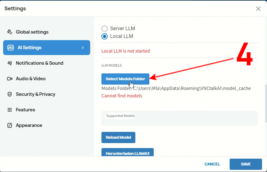 Click on Select Models Folder and select the folder Local-LLMs we created in Preparation.