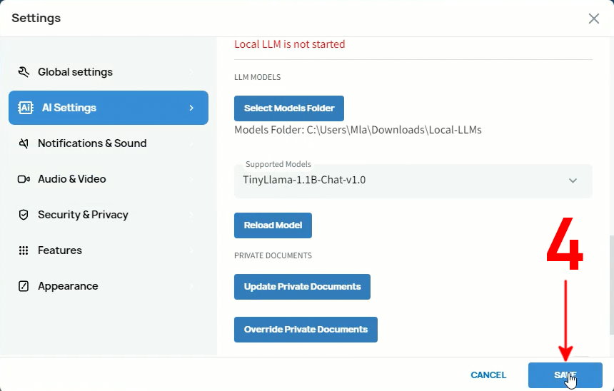 After all models you like to use have been downloaded, you need to select, which one you want to use for local AI processing.