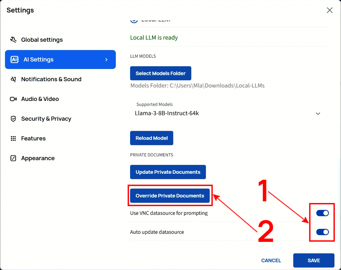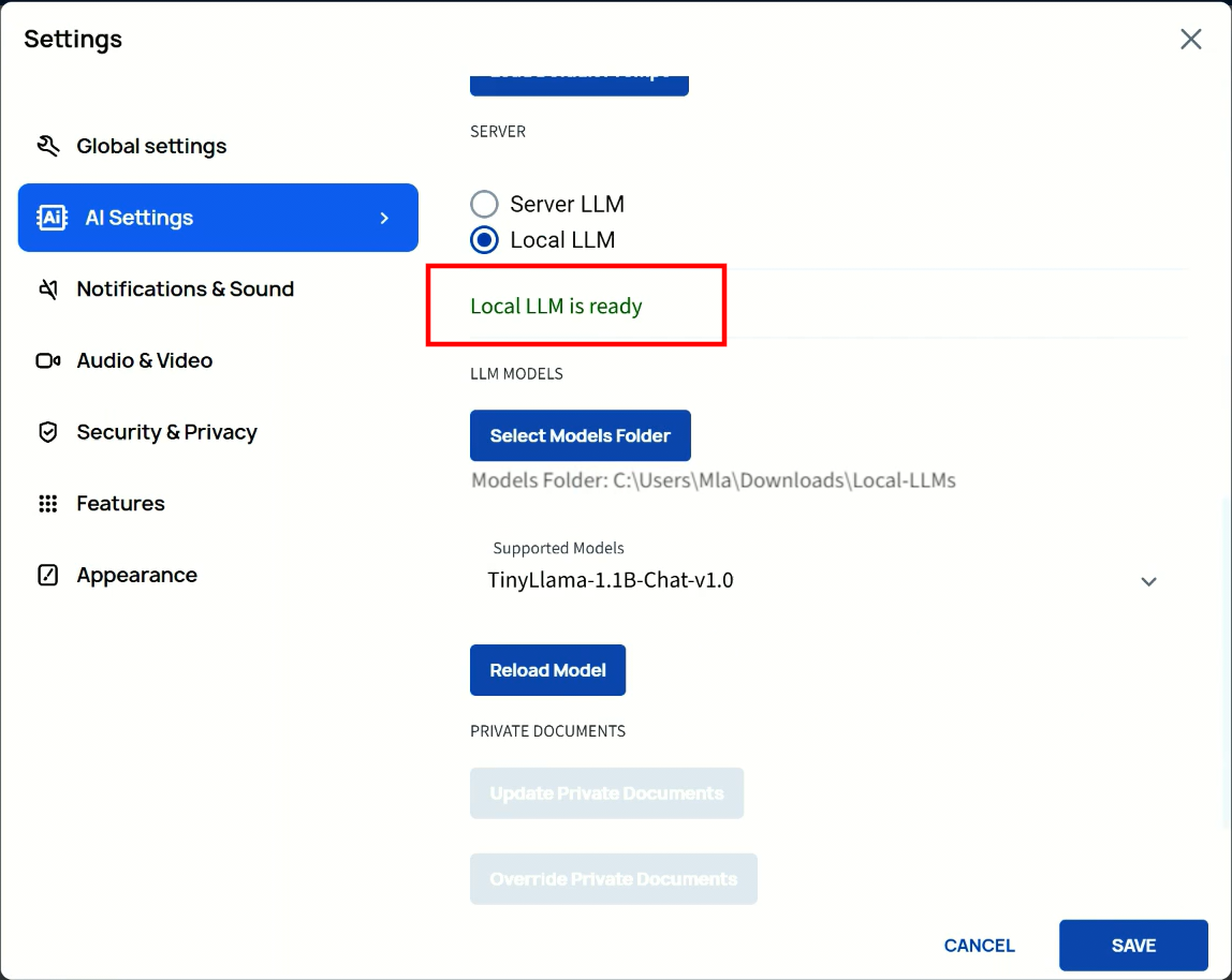 When you open preferences again, you will see, that the read notification about the Local LLM has changed to green now, informing yopu, that the Local LLM is ready as well: