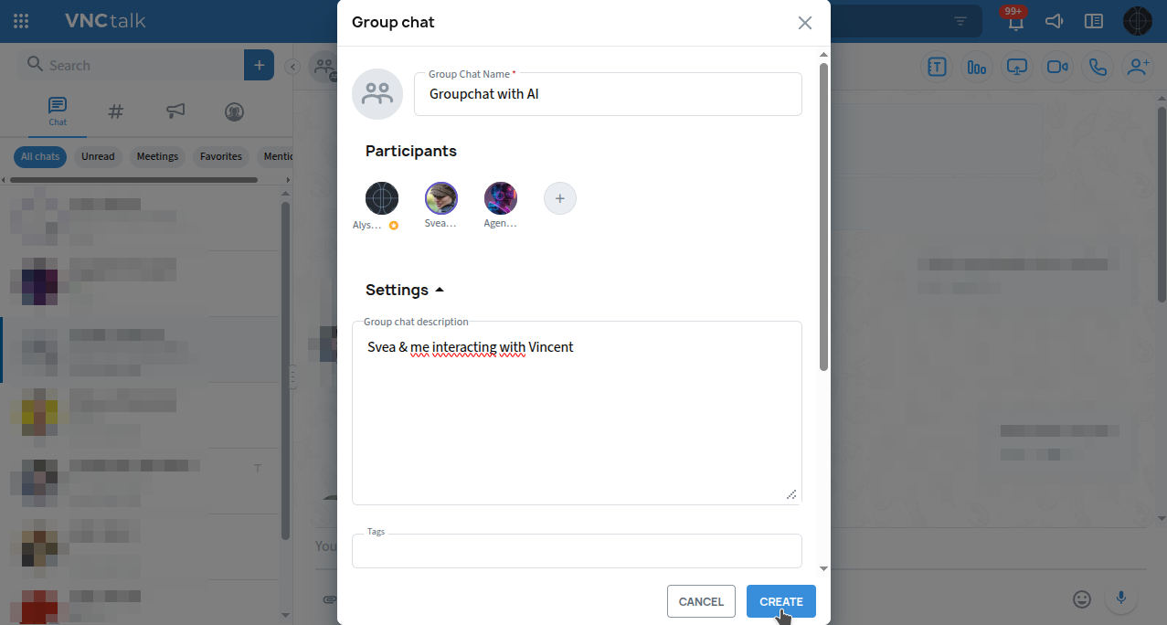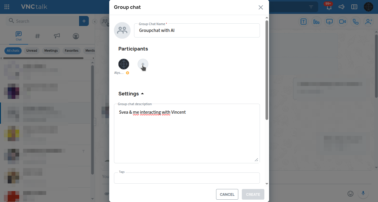 Add participants (+) to the Groupchat, including the AI-agent Vincent
