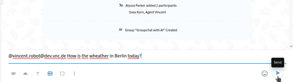 "@Agent Vincent [Question]" (e.g., "@Agent Vincent How is the wheather in Berlin today?").
