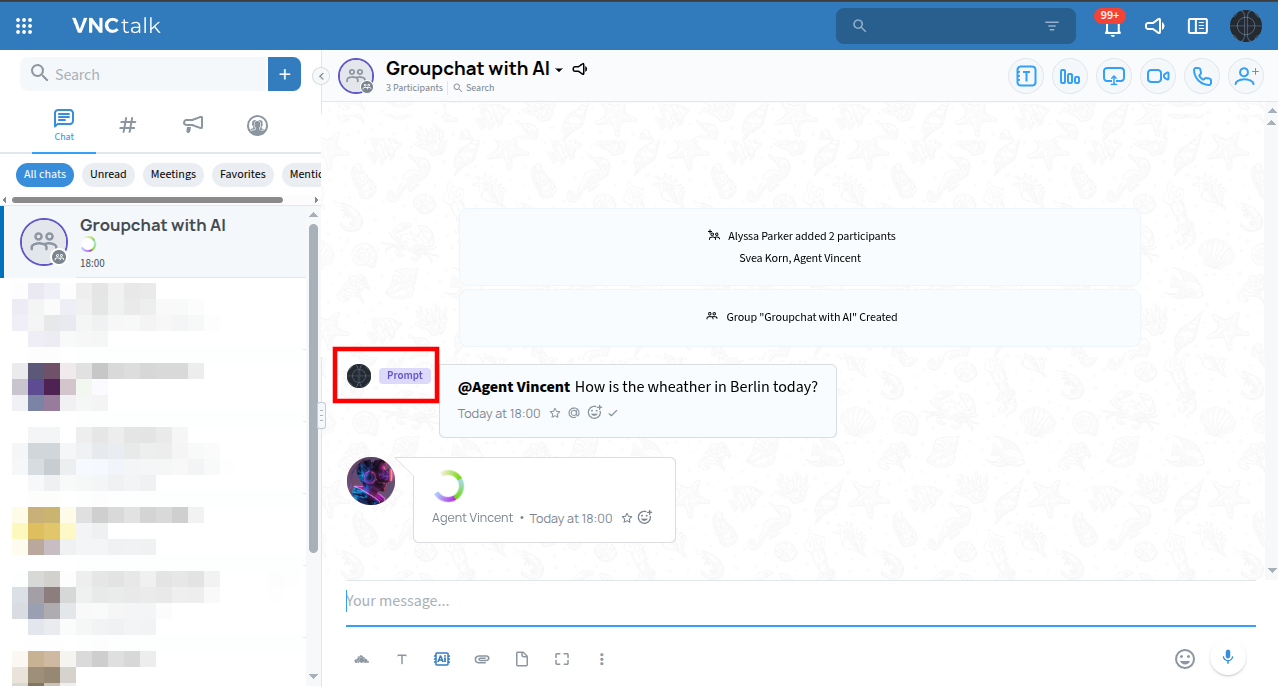 Create/Add to Group: Start a new group chat or add the AI-Agent to an existing one via participant list.