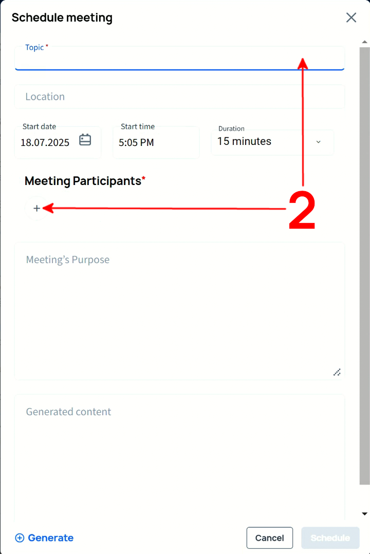 In the opening input mask, enter a topic and click the "+" button to add the desired meeting participants
