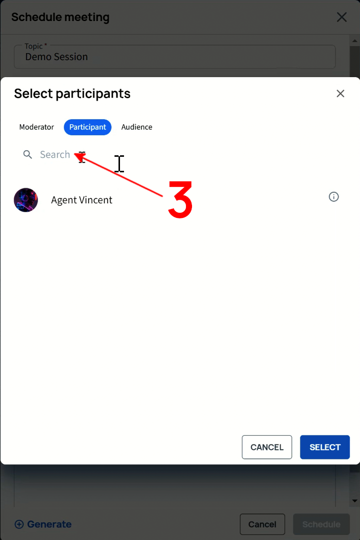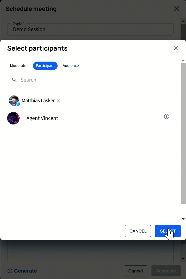 Now search and add the desired participants to the participant list and click SELECT when done.