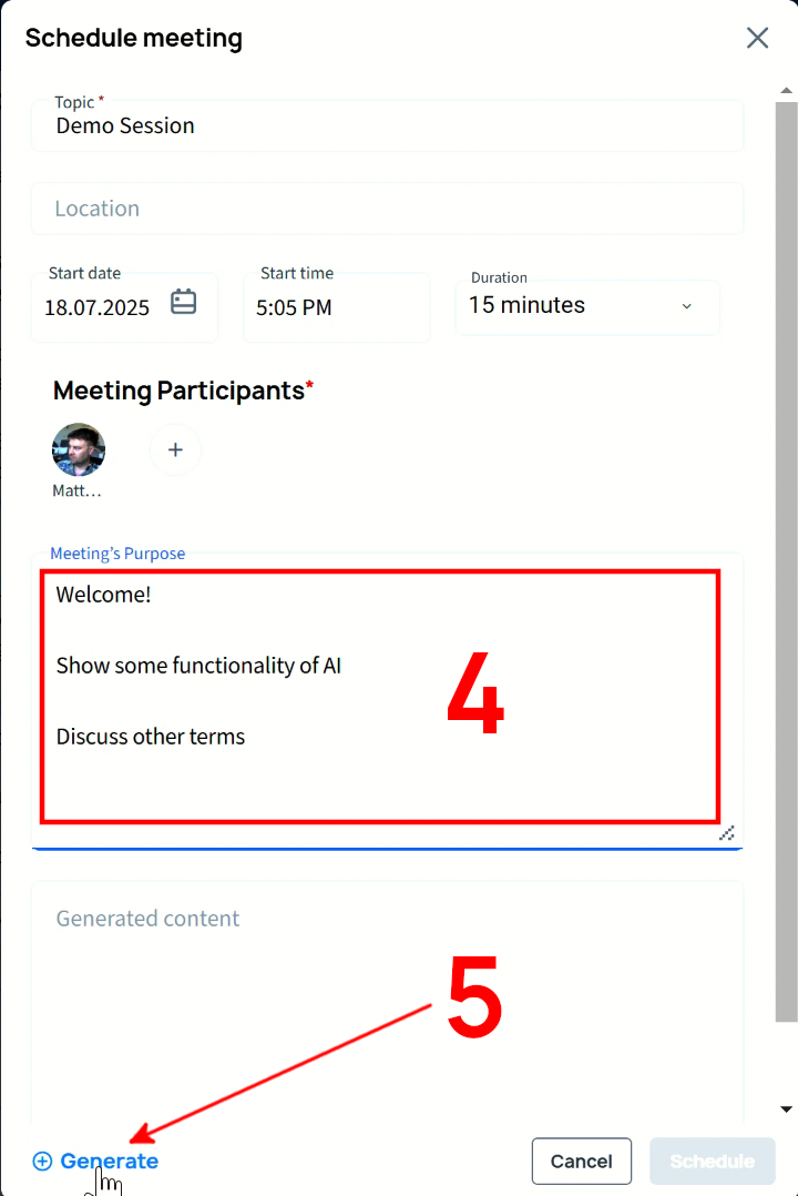 Back in the Schedule meeting interface, you have to enter some key information, on what the meeting is about, into the Meetings's Purpose field.
