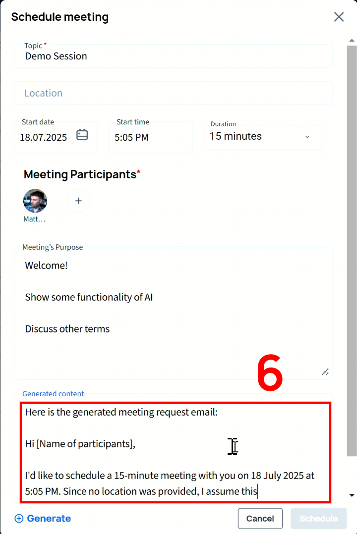 When VNCai is done generating, you can review the result and adjust it to your needs, if required. When done, click Schedule to create the meeting in VNCtalk, in your VNCmail calendar and triggers the eMail-invites to the participants.