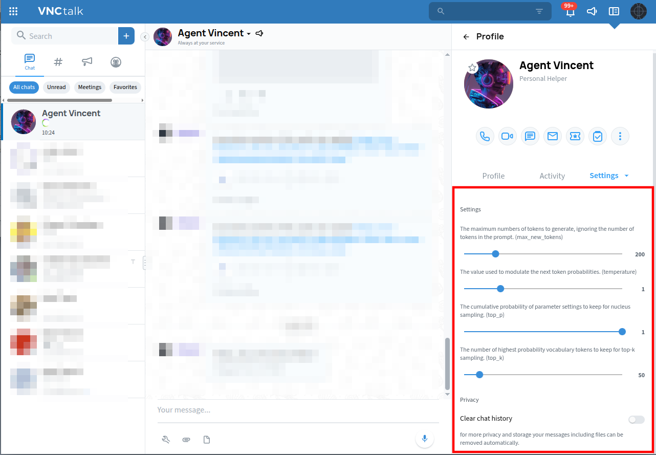 Use Case Temperature Top-p Top-k Max Tokens Technical Documentation 0.3 - 0.5 0.2 - 0.4 100 - 200 500 - 800 Business Emails 0.6 - 0.8 0.5 - 0.7 200 - 300 300 - 500 Creative Content 1.5 - 3.0 0.8 - 0.95 300 - 500 600 - 1000 When activating the switch Clear chat history you can select, how long the chat history with Vicent should be remembered, available options are