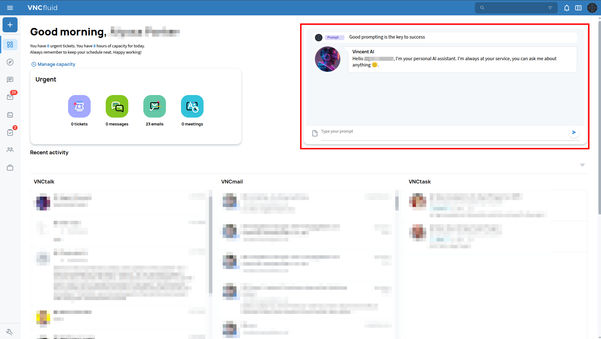 VNCai, when deployed, is accessible as a plugin for VNCtalk through the AI agent Vincent and via dashlet on the VNCfluid dashboard.
