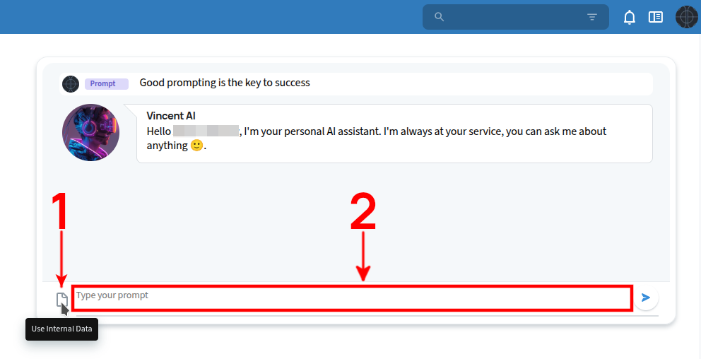 This will open a 1:1 Chat with the AI-Agent Vincent, with whom you can interact by typing prompts (e.g., questions, requests) into the input field and receive responses in the main chat window.