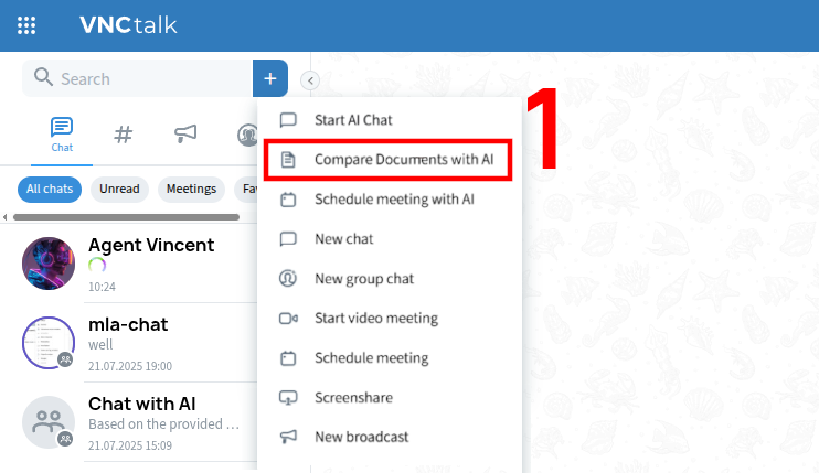 To compare documents in VNCtalk, click "+" and select Compare Documents with AI from the opening dropdown menu