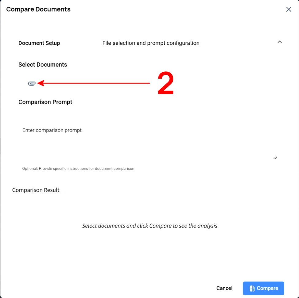 In the opening iterface, click the paper clip icon to upload the files you want to compare. This will open the file picker of your OS to select the files