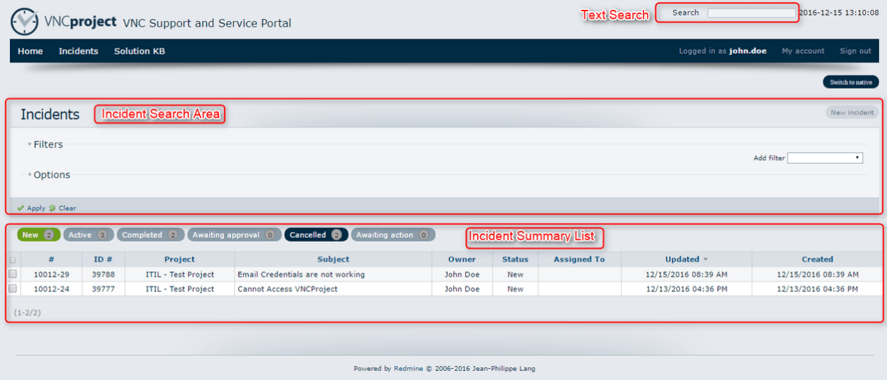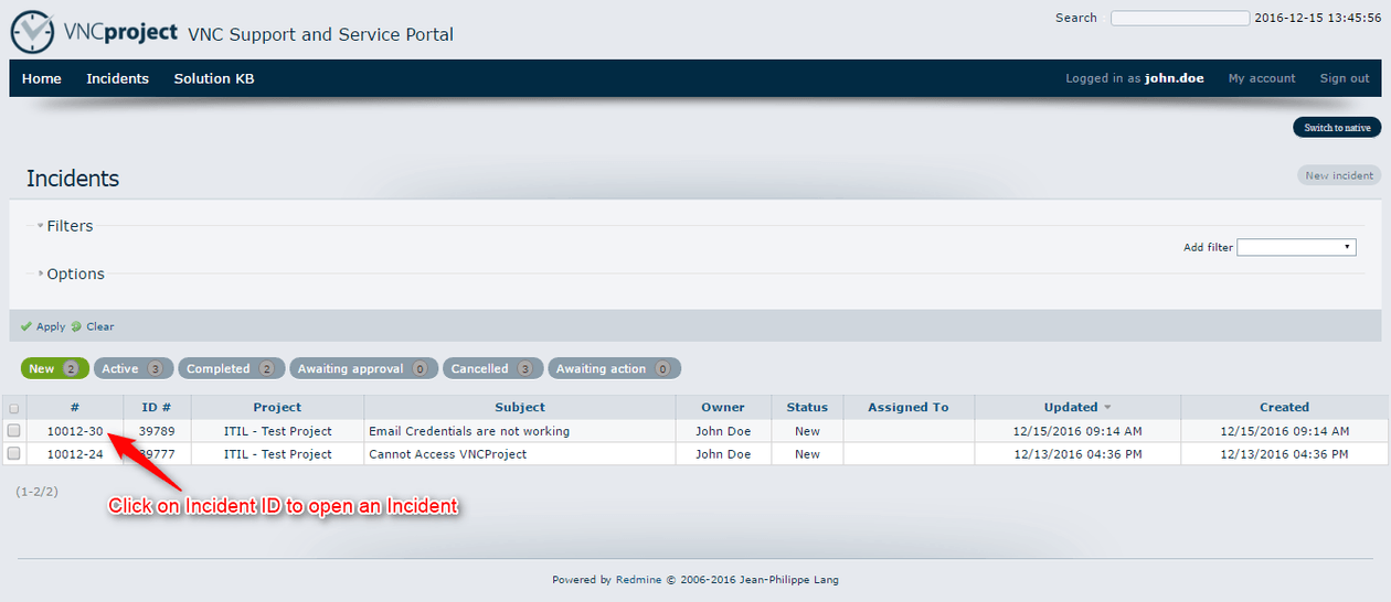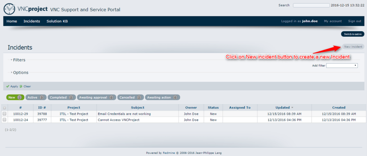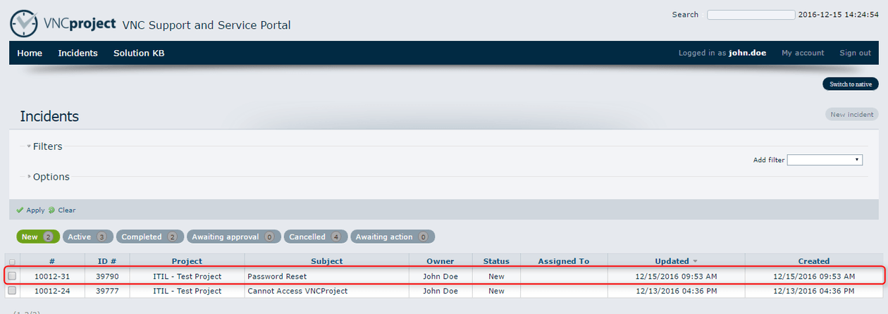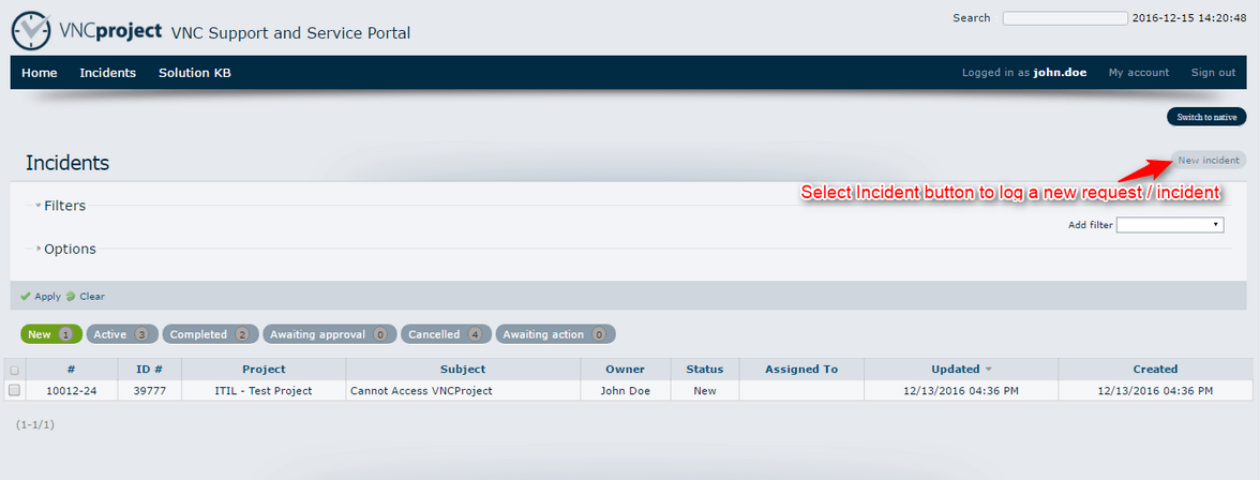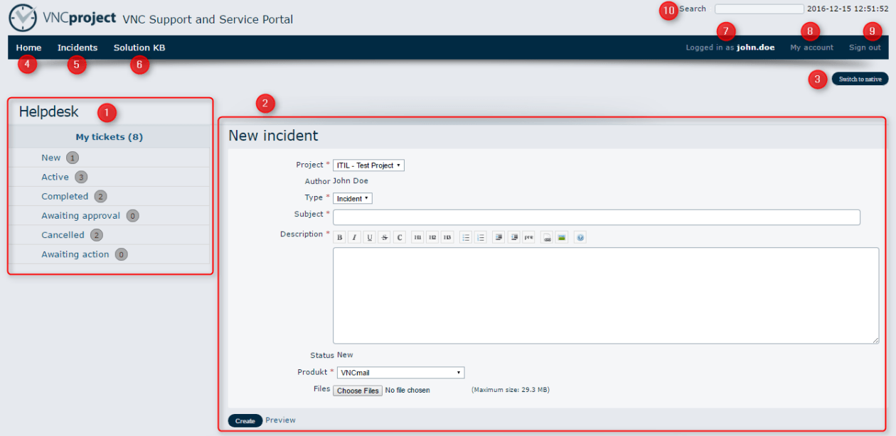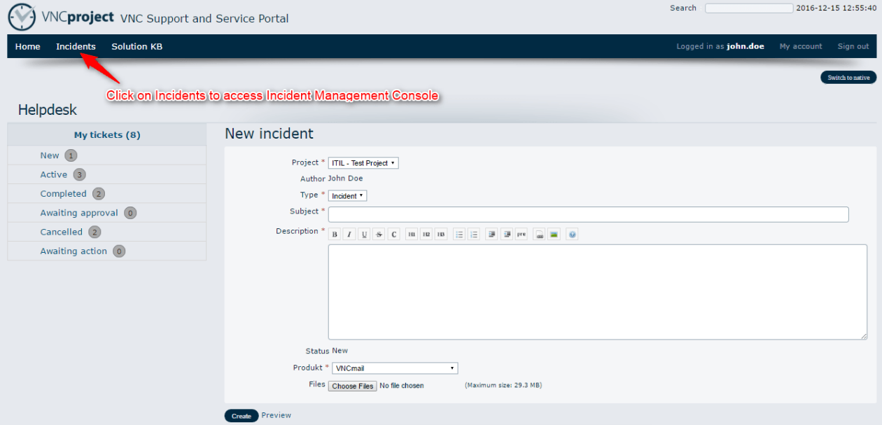 To create a new incident or request by yourself, log-in to the VNC Helpdesk with your credentials. You will be redirected to your Home page, where you can start filling up the New incident form right away. Alternatively you can open the New incident form by clicking on the New incident button when located in the Incident Management Console.