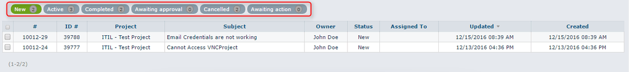 The tickets are grouped in tabs, sorting the incidents by their current status. This way the interface enables you to manage your tickets in a better way as you know exactly at which state each ticket of yours or of your company members is currently residing.