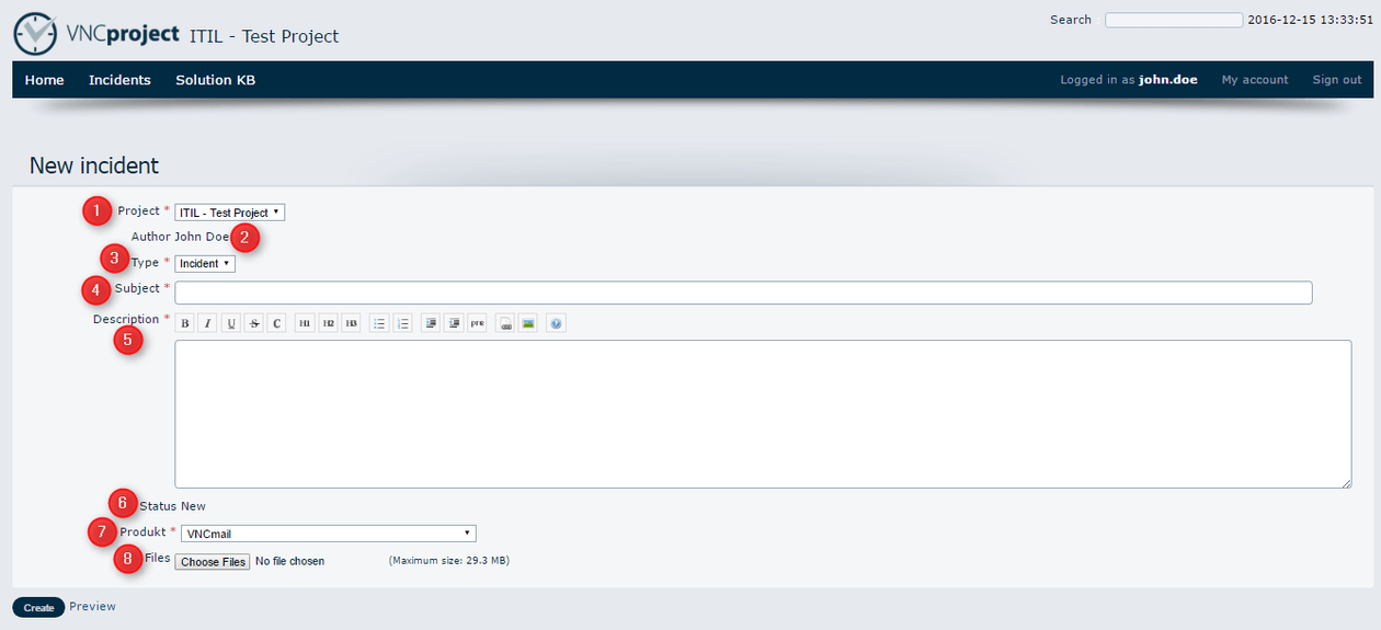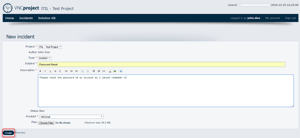 Now fill up the new incident form and add all the information necessary and where you think it will help the support staff to understand your request and click on Create to save your ticket: