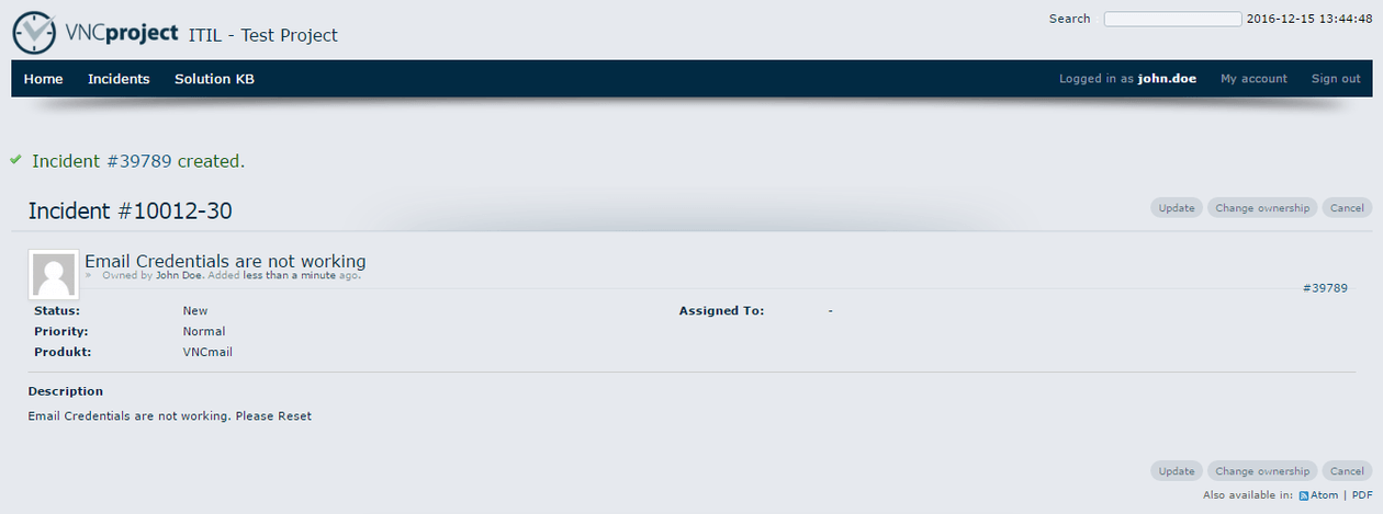 Once you have created the ticket, you are redirected to the Incident view screen along with the message Incident created displayed on screen and a notification per eMail that a new incident has been created: