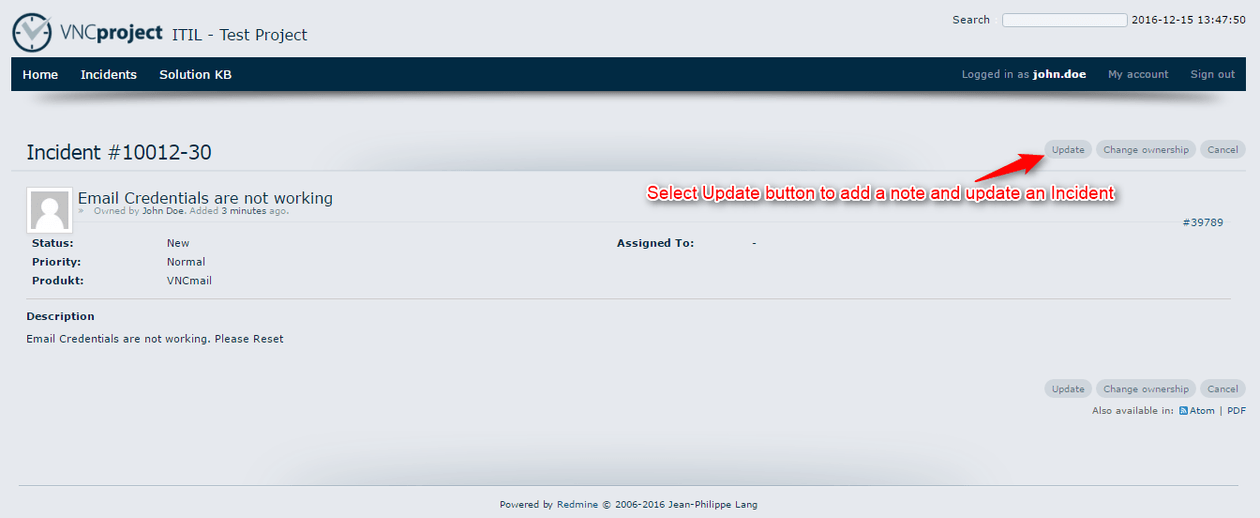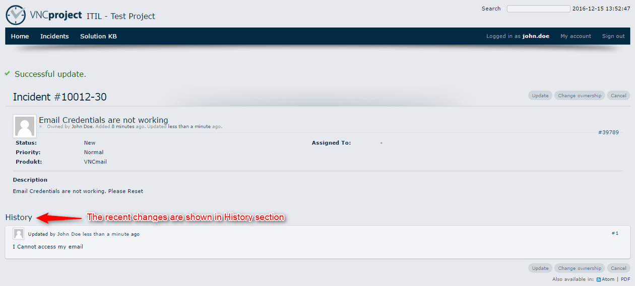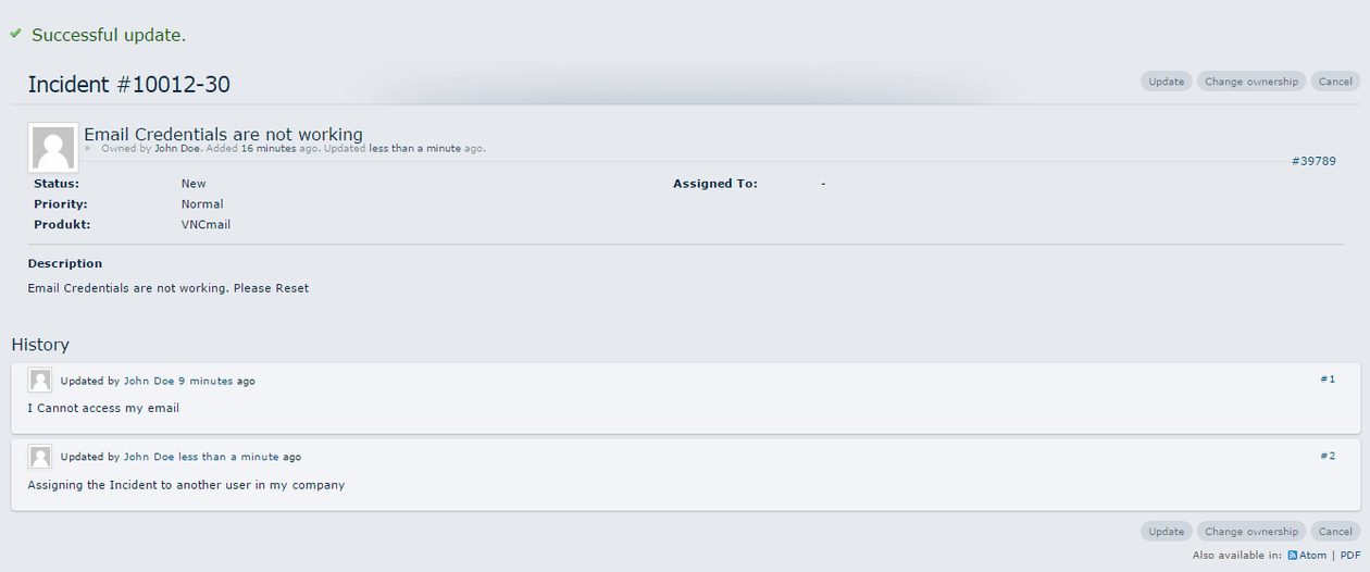 After submitting your update, you will be redirected to the Incident view page again where your update/notes are added to the ticket's history. In case the incident has already been assigned, the assignee and you will be notified via eMail, that the ticket has received an update adding a new note.