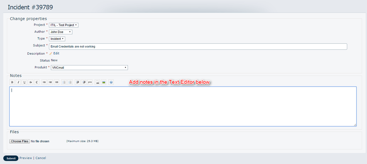 - The incident has already been picked up and assigned to a member of the Helpdesk staff. Now you cannot modify the ticket's header anmore and you now you have a textfield and an option to attach files available to add your update information to the ticket: