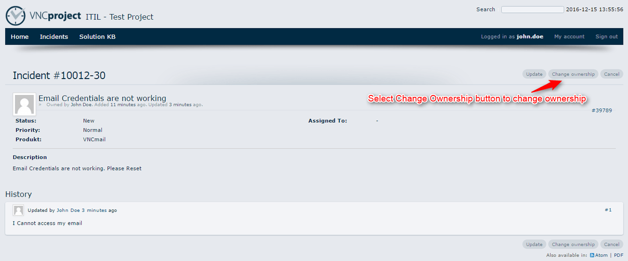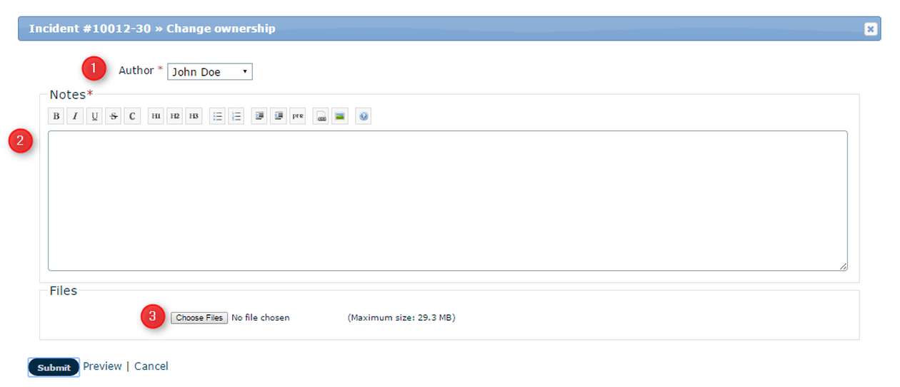 Therefore it might be necessary to transfer the ownership of an incident to another company member, to take over open tickets in case of an inavailability of the current owner, eg. in case of the owner is going on vacation.
