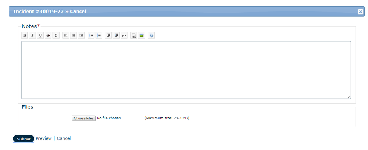 a window will pop up, where you must leave a short (mandatory) note, stating a reason and to prevent accidental cancellation of incidents: