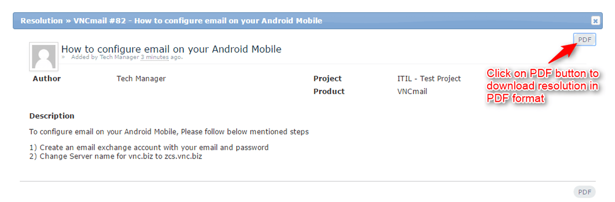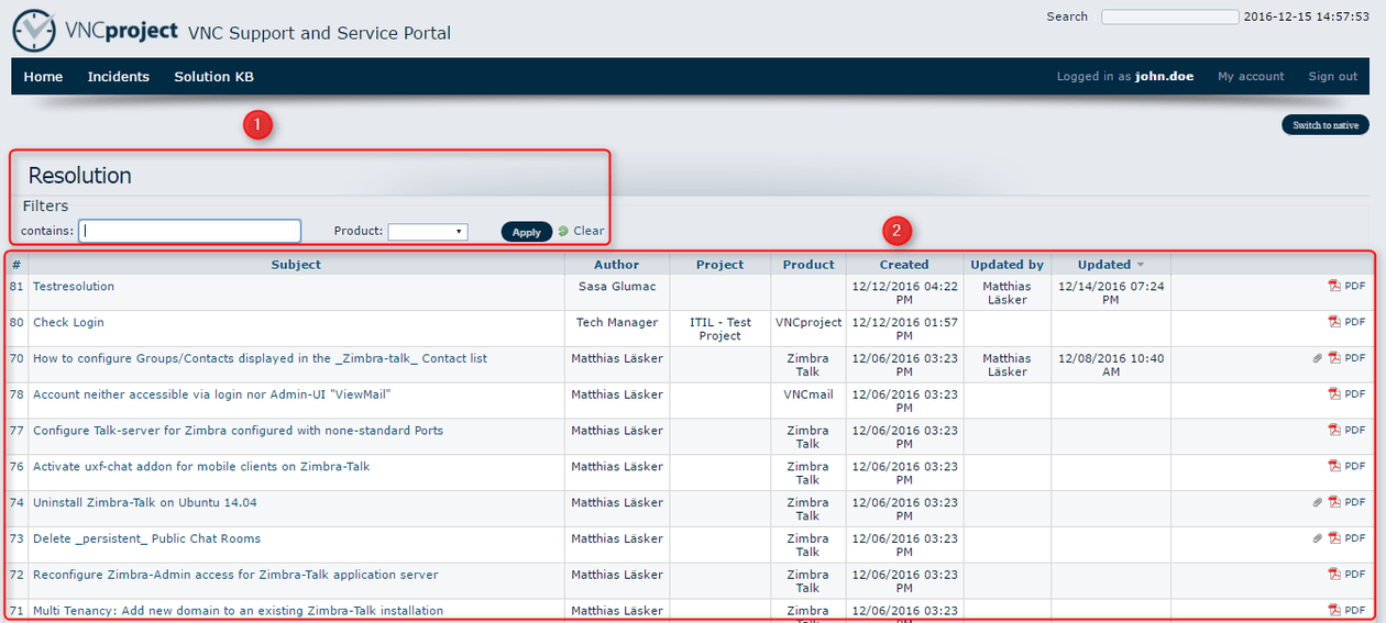 To view a KB-article, click on the ID or the Subject of that particuliar resolution in the Resolution list view. You can also export an KB-article as PDF-file from here by clicking on the PDF logo on the right side of that article.