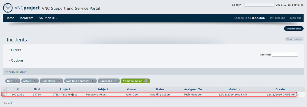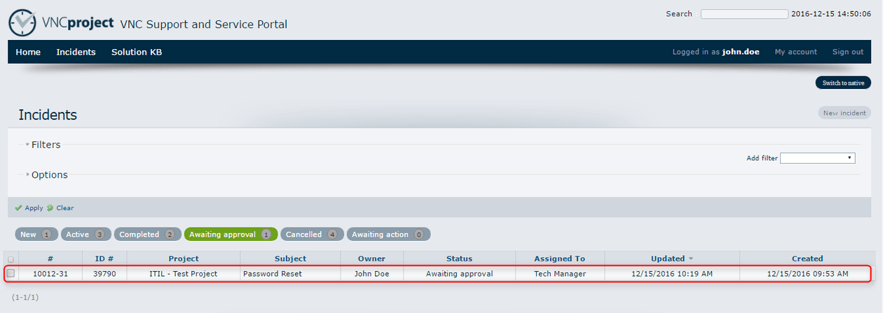 When the support consultant has solved your request and provided a solution to the reported incident, you will receive another notification via eMail, mentioning that your ticket's status has changed to Awaiting approval. Now the ticket has moved to the Awaiting approval tab in the Incident Summary List.