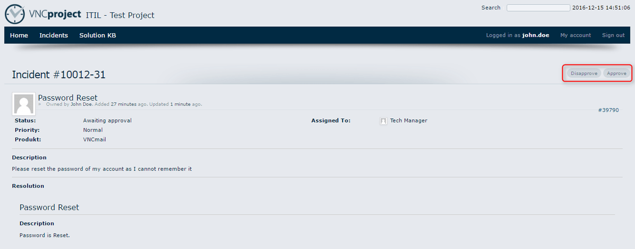 Now an action is required from your part again, where you can either Approve or Disapprove the proposed solution when opening the respective ticket: