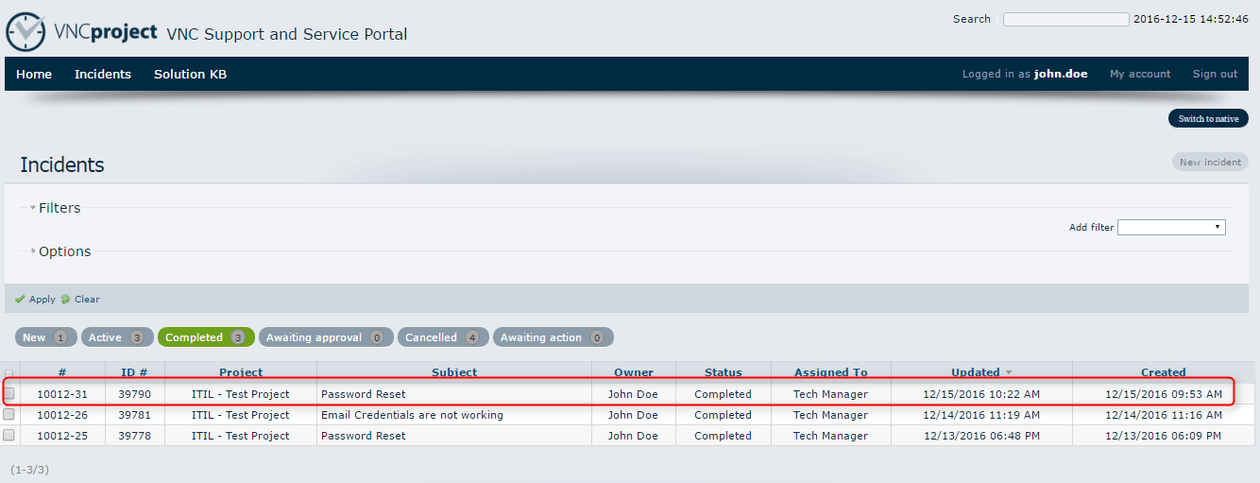 - If you click the Approve button, the incident is considered to be solved, the ticket's status is changed to Completed and it is moved to the Completed tab in the Incident Summary List. After clicking Approve you can leave an optional note to the assignee.